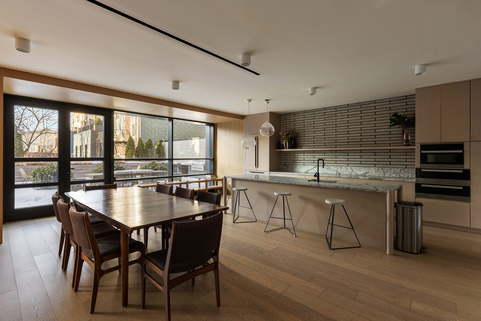 The residences at 510 Driggs are pristine and saturated with natural light. They were designed for the modern lifestyle, and they feature beautiful finishes that include European white oak floors, floor-to-ceiling curtain wall windows, open-concept layouts, convenient in-unit washers/dryers from LG or Miele, and chic bathrooms with custom vanities, marble floors, and Toto toilets. Kitchens are equipped with honed Grigio pearl marble countertops, custom cabinets, eat-in peninsulas or islands, and high-end appliances from Miele. Many units also come with a private balcony or terrace.