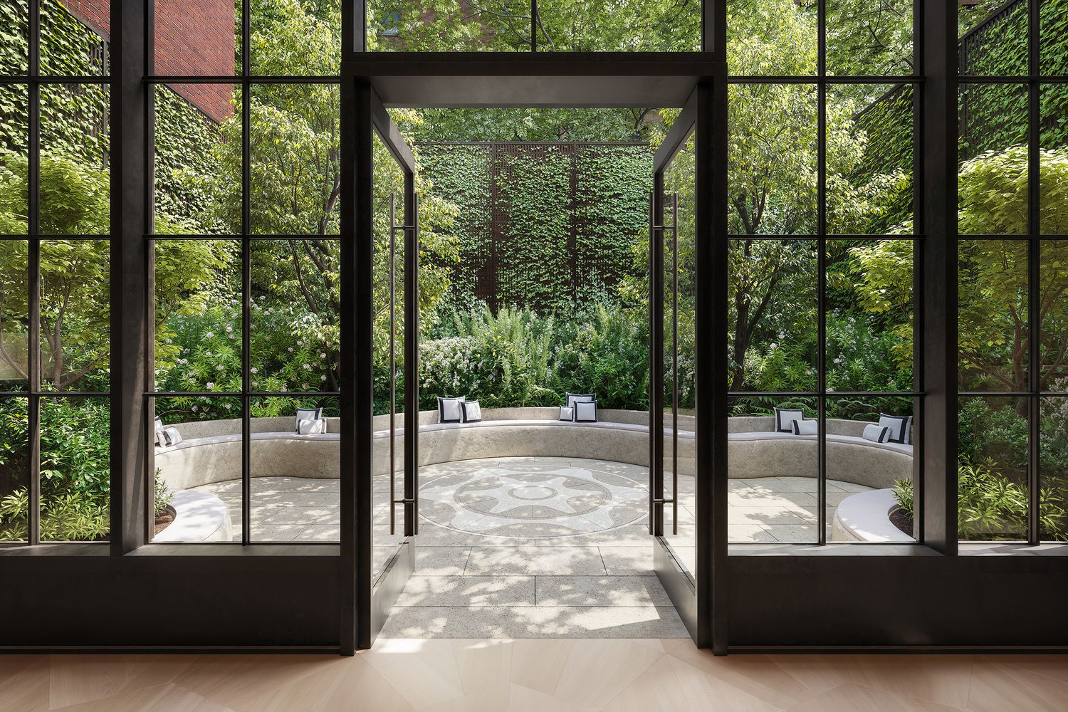 The building’s red brick façade, designed by COOKFOX Architects, is inspired by New York’s architectural heritage, with elegant arched bays and oversized windows that create a seamless blend of warmth and modern sophistication.